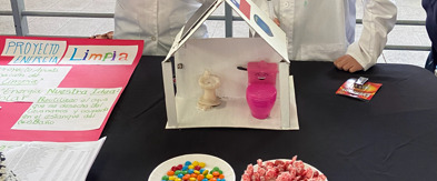 Maqueta de baño ecológico con sistema de ahorro de agua y reciclaje de residuos. Utiliza Circuitos, Protoboard, Bomba de agua y Pulsador.